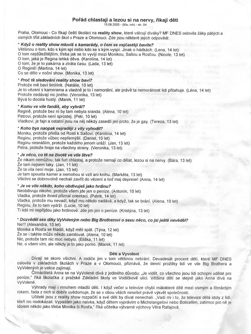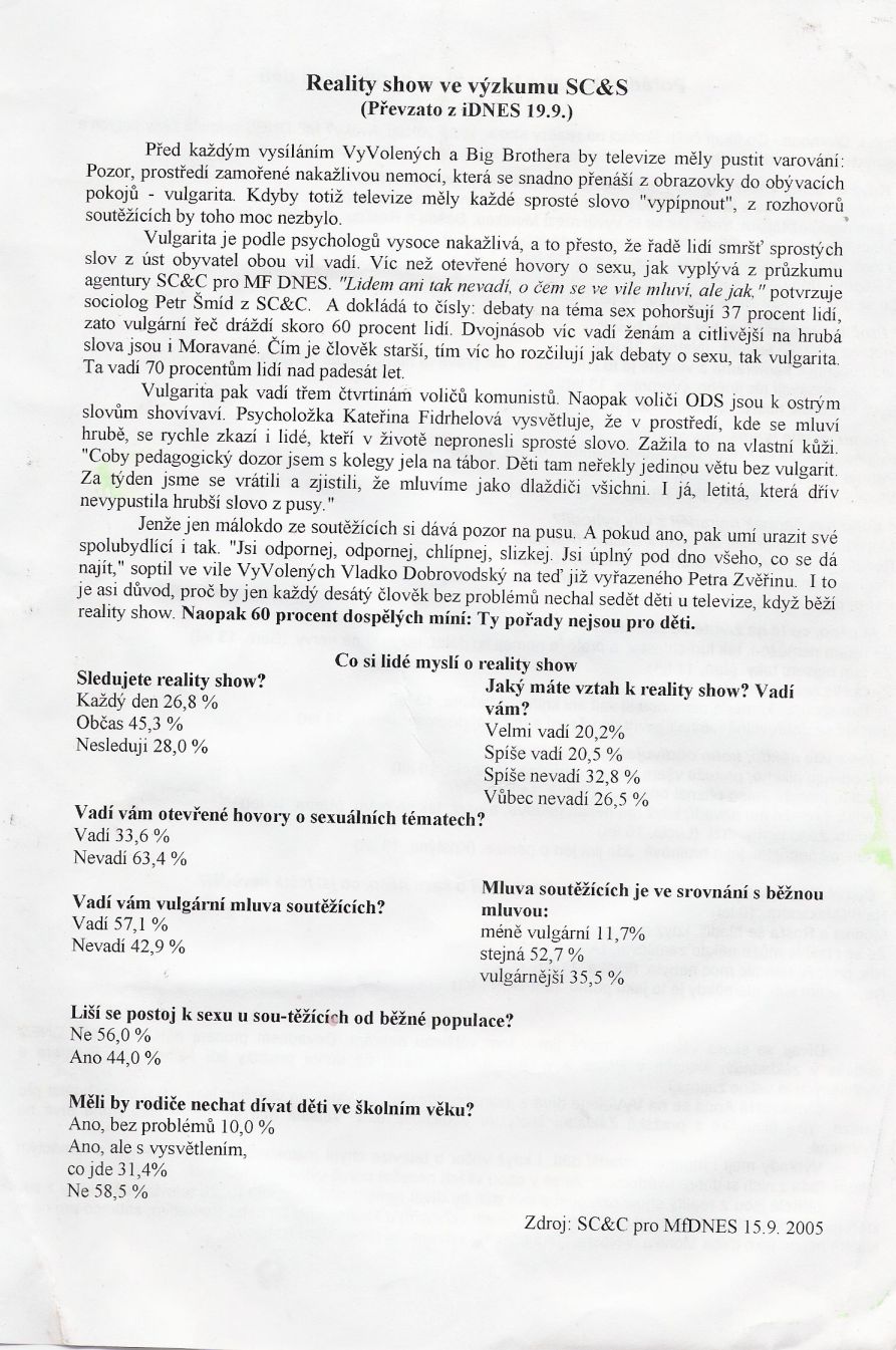 Vlastní výběr provádějte dobrovolným zápisem. Před tím vším je dobré přečíst studii o tom, proč měly reality show takový úspěch (a proč jej neměly) a o co v nich vlastně jde. Pokusím se ji sem dodat...