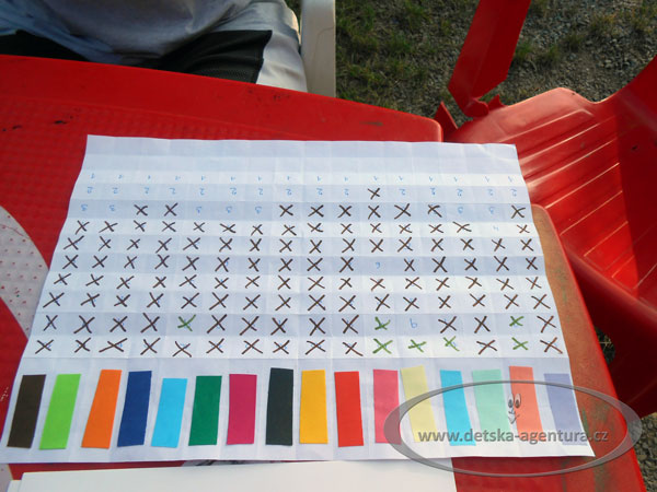 Potřeby: Barevné papírky v X různých barvách po 10 kusech, označení stanovišť, tabulka na shromaždiště, fixy