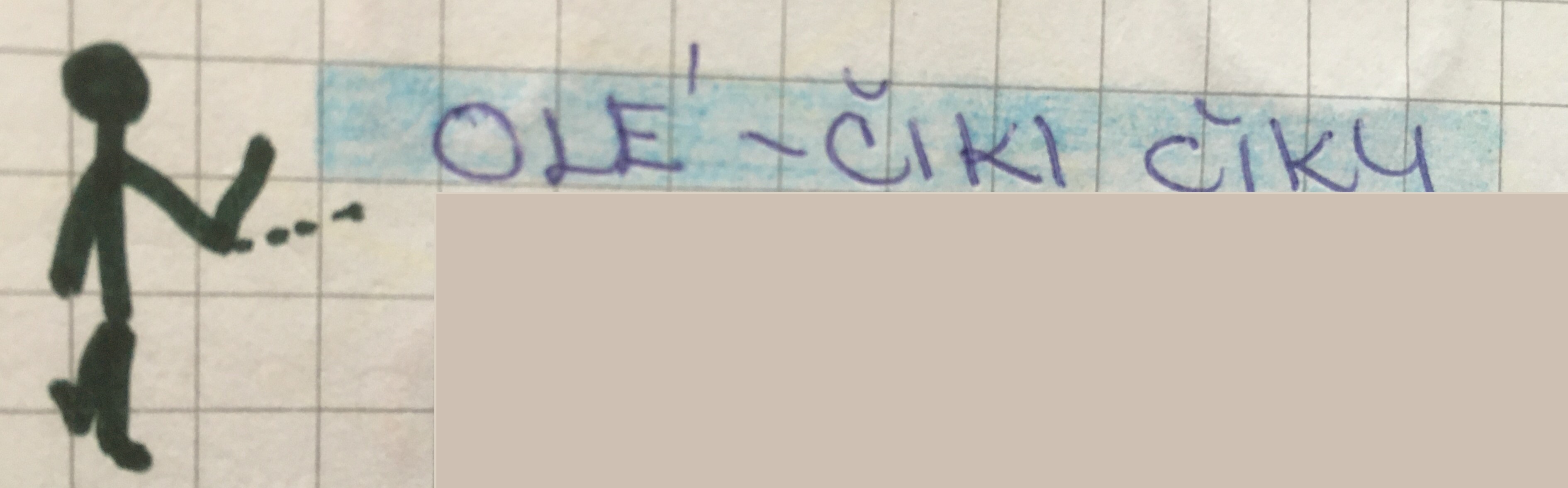 Při slově olé se všichni natočí bokem ke středu kruhu. Posouvají rukou a říkají čiki čiky.